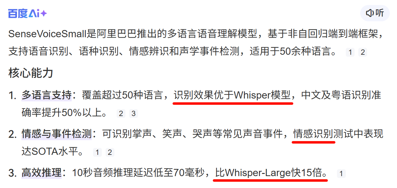 现在这款阿里推出的国产开源模型 SenseVoiceSmall,在中文和粤语处理方面的能力要强上很多。