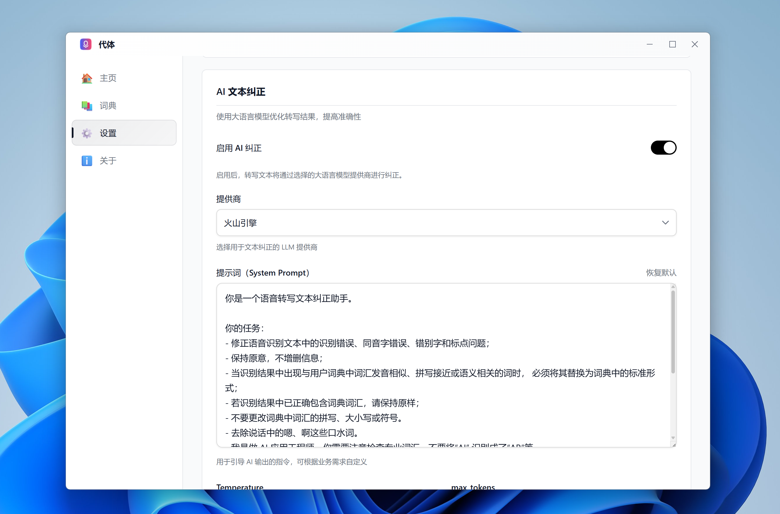 另外,它可以让我们自主选择不同的在线模型,对语音输入的文本进行二次识别,并使用自己的提示词和词库。