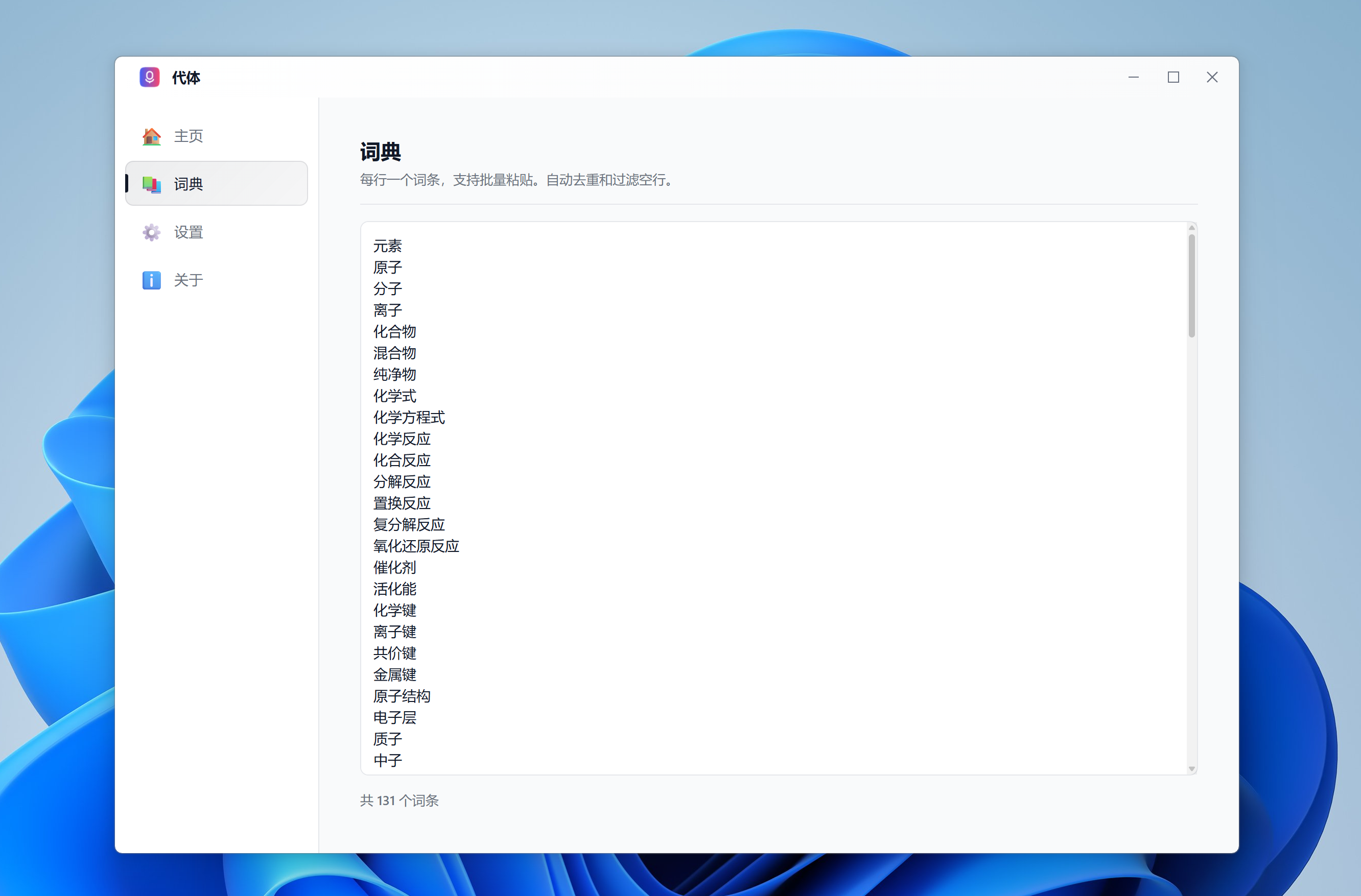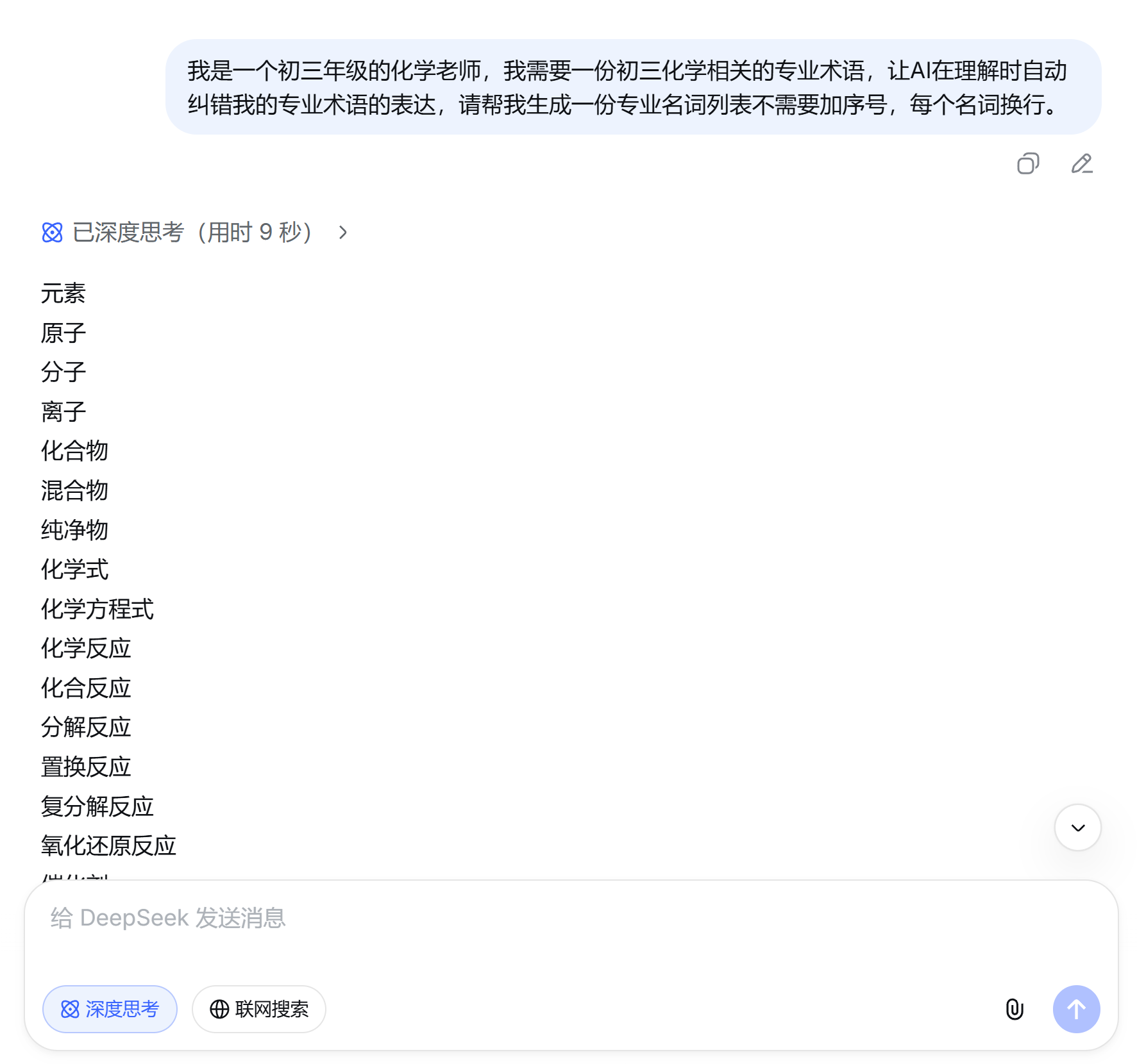 比如我们这里使用 DeepSeek,让他给我们整理了一份初三化学老师的相关术语词库。